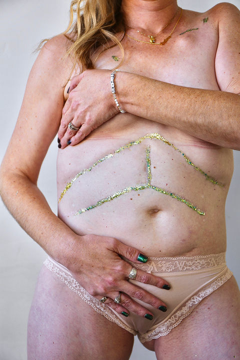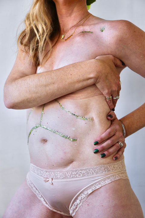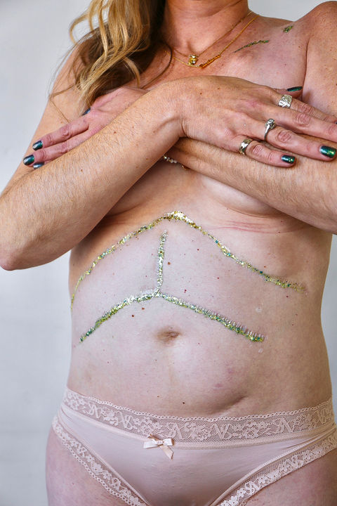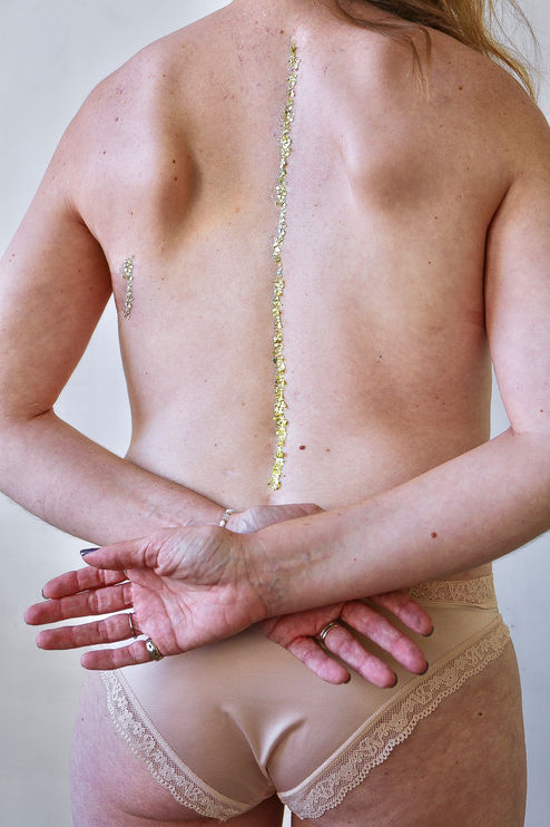 My first large scar is from scoliosis surgery. Since it is the whole way down my back, I don’t see it every day and it always felt a little surprising when I would hold a mirror and look at my back. I remember when I was younger, I used to use my long hair to cover it and never liked wearing shirts that would expose my back. It is wild how our perspectives change as we age, because at a recent speaking engagement I wore a beautiful gown where my entire back was exposed and I was proud to show my scar and honor all my body has endured and overcome.